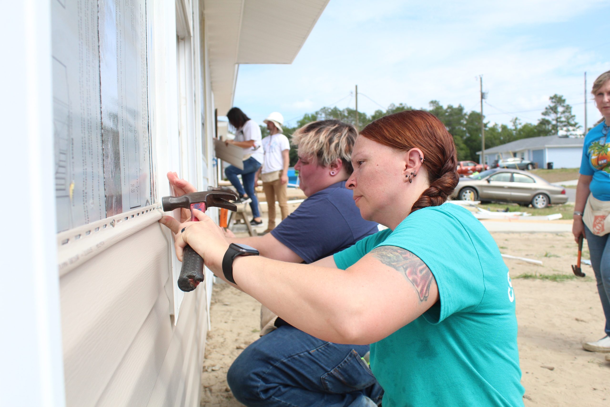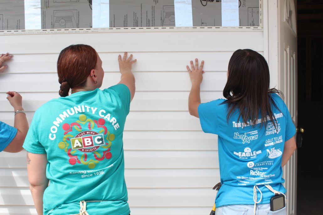 - Heather Rogers, left, and Daemon Wildes from ABC Fine Wine & Spirits, help install vinyl siding on a house during a recent Community Build Day at Habitat of Citrus Springs. ABC Fine Wine & Spirits’ team of 12 employees contributed 58 hours of work to various homes during their Community Build Day.